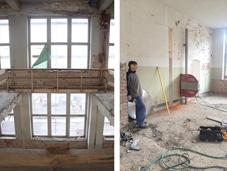 Die Rohbauer beginnen derweil mit den Schneidearbeiten im Gebäude. So entsteht das neue Treppenhaus (links)